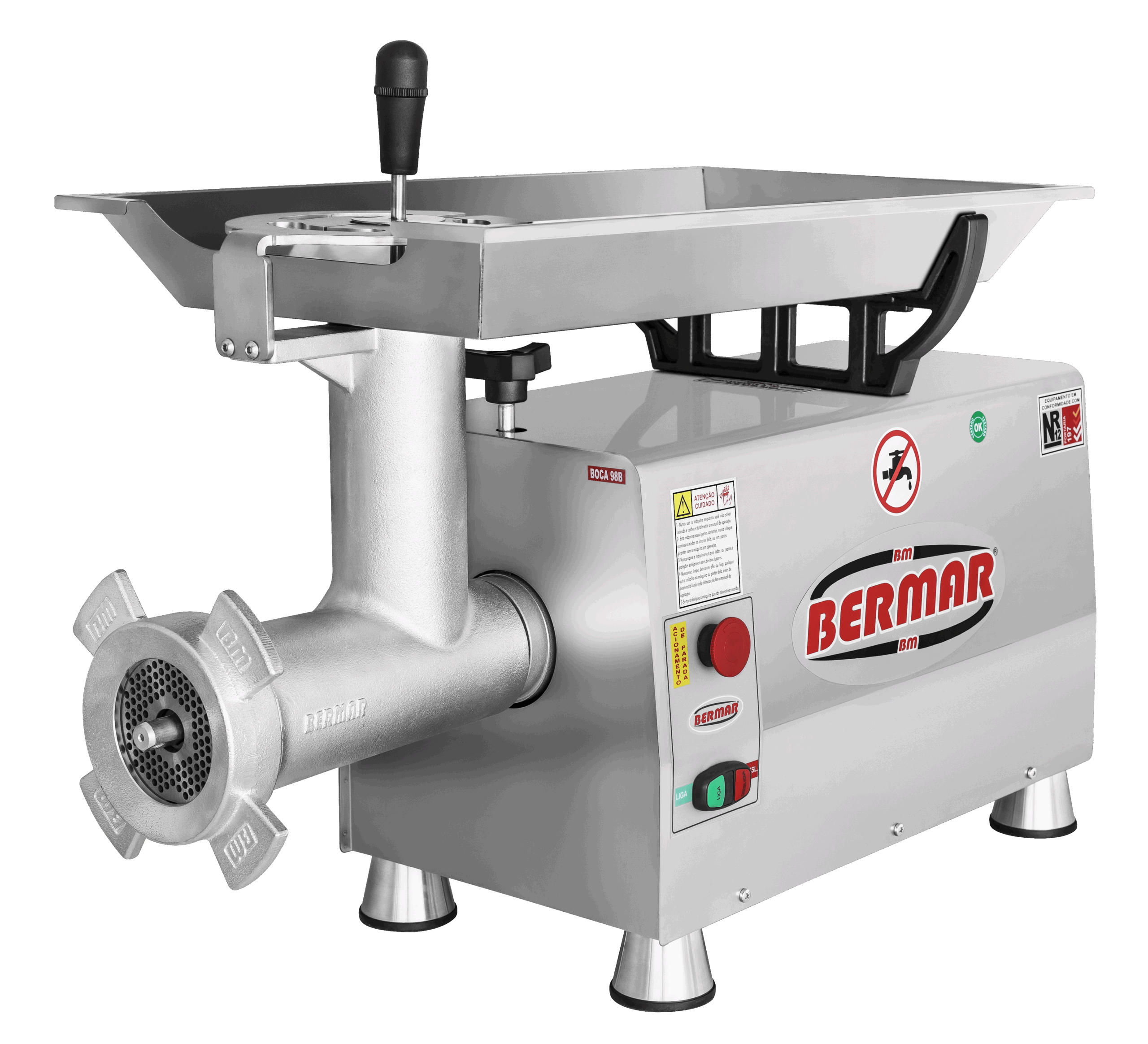 O Picador de Carnes Bermar - Boca 98 B possui bocal em aço inoxidável 304, um material altamente resistente à corrosão e ao uso intenso, garantindo maior durabilidade e facilidade na higienização.